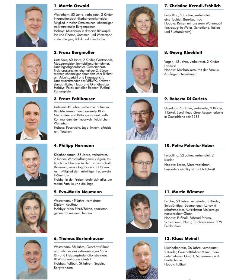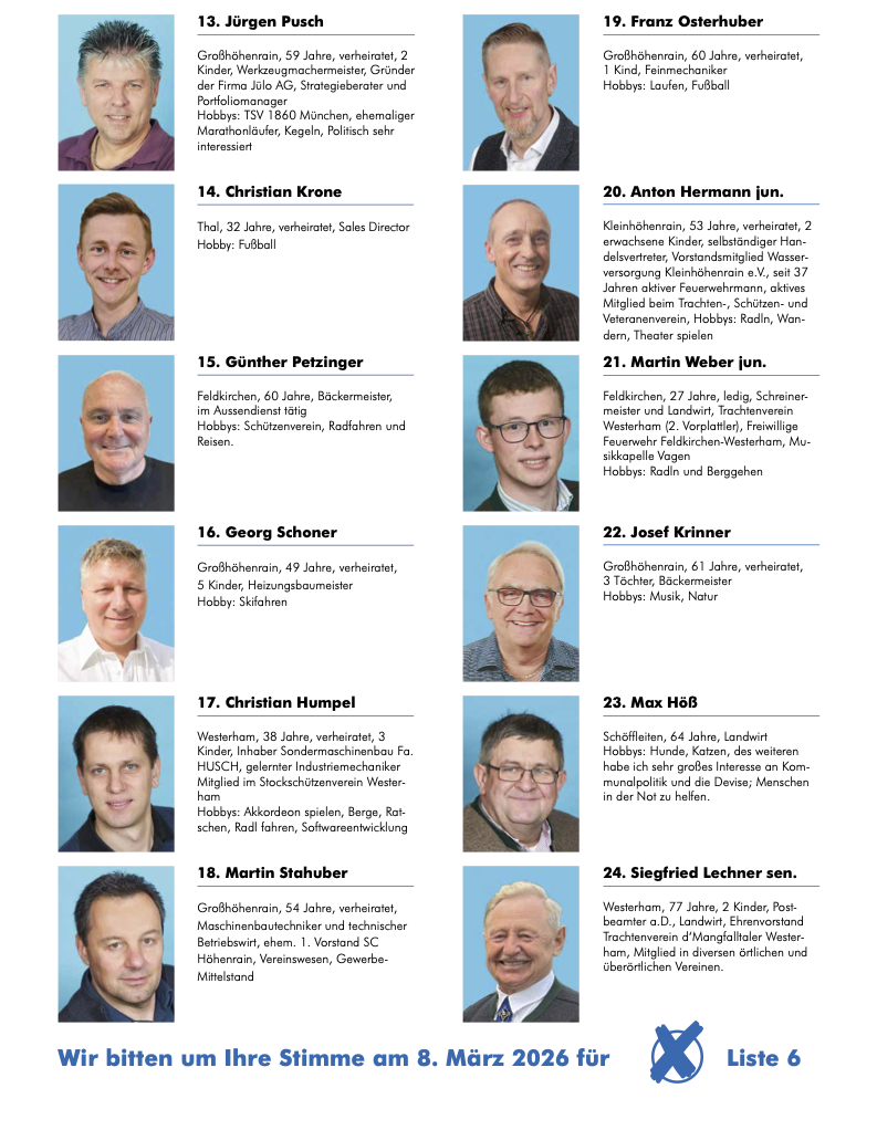 24 engagierte Kandidatinnen und Kandidaten stellen sich für Pro Bürger zur Wahl. Sie kommen aus allen Ortsteilen und bringen Erfahrung aus Handwerk, Wirtschaft, Landwirtschaft, Ehrenamt, Verwaltung und Vereinsleben mit.